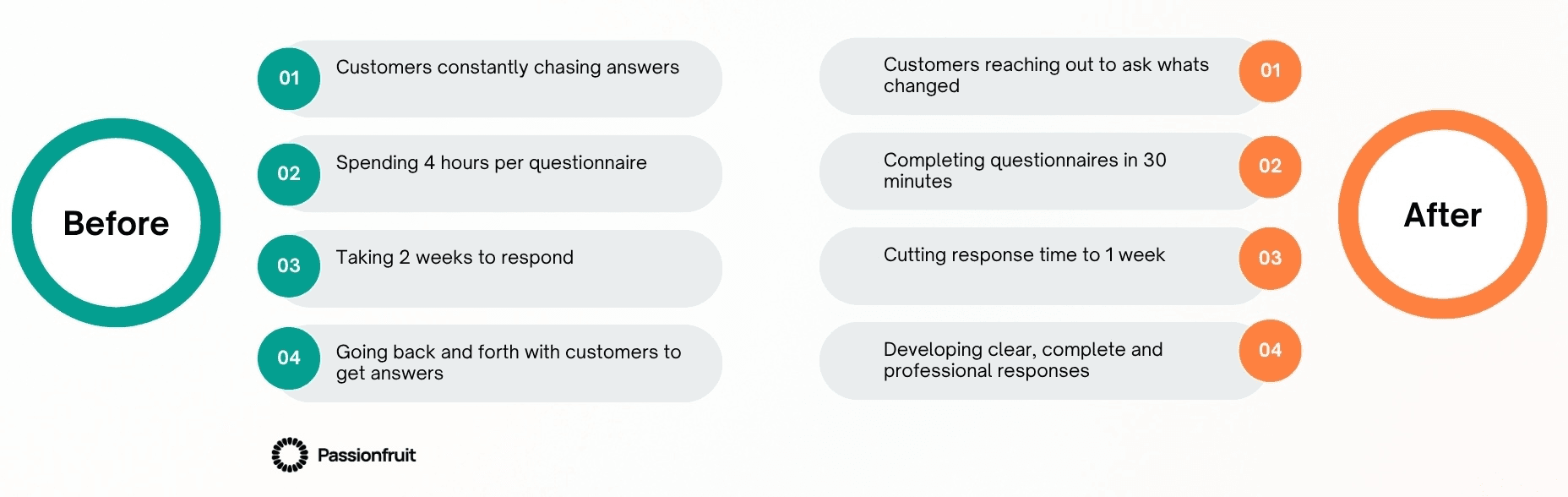 "Customers literally called us to ask what we changed. More complete answers, faster turnaround - and internally we spend 75% less time per questionnaire "
